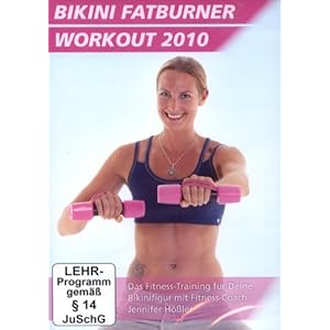Mit dem Bikini Fatburner Workout 2010 hat Fitness-Coach Jennifer Hößler für Dich ein neues Fitness-Training zusammengestellt, um Deine Figur in Bikiniform zu bringen. Ein Bikini verbirgt nichts an Deinem Körper, deshalb beinhaltet dieses Workout ein komplettes Ganzkörpertraining. Fett verbrennen und Körperpartien straffen lautet die Devise. Um die Effizienz Deines Trainings zu erhöhen und zügig sichtbare Resultate zu erzielen hat Jennifer Kurzhanteln und einen Step in dieses Programm eingebaut. Trainiere ganz flexibel zu Hause vor dem Fernseher und bringe Dich in Form für die nächste Bikinisaison oder einfach für Dich.